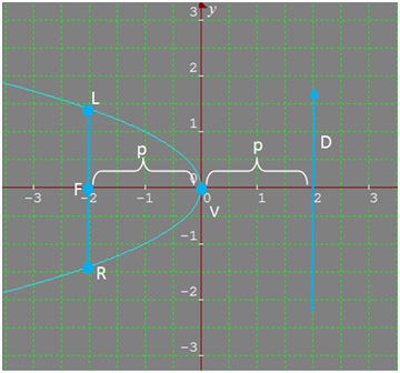 -lado recto (LR): es la recta que une 2 puntos de la parábola, pasa por el foco y es perpendicular al eje de la parábola. La medida del lado recto es lo equivalente 4 parámetros: LR = |4p|