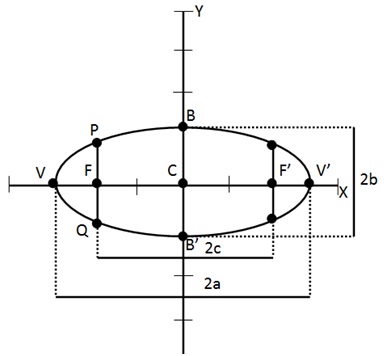 Vértices V y V’ lado recto PQ eje focal FF’ = 2c
