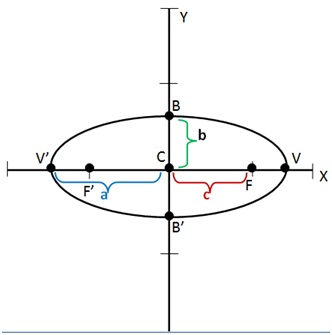 2.- el eje de las ordenadas (y) será el eje menor y el punto de intersección de ambos ejes será el centro de la elipse.